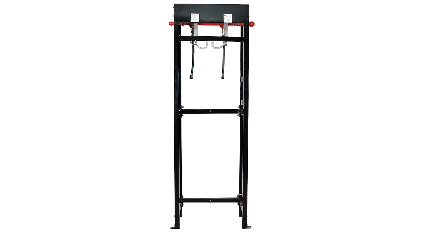 Constructed from high-strength steel with a corrosion-resistant coating, this rack is engineered to support two or more vertically mounted fire suppression cylinders. The design features an integrated mounting system of clamps and brackets to ensure maximum stabilization, while the open-frame architecture provides technicians with unobstructed access to valves and piping for maintenance. Built for safety, the rack is designed to withstand vibration, accidental impact, and significant environmental stress. For a secure installation, the unit is floor-mounted via dedicated anchor points and is completed with an industrial-grade black finish for long-lasting durability and a professional aesthetic.